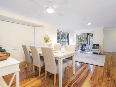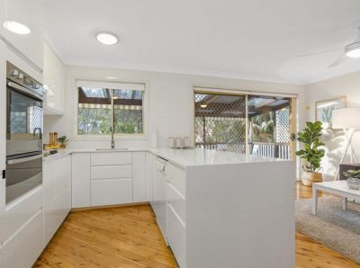 The modern, eat-in kitchen has a stunning timber floor flowing out onto sunny entertaining deck overlooking the level and fully enclosed backyard.
